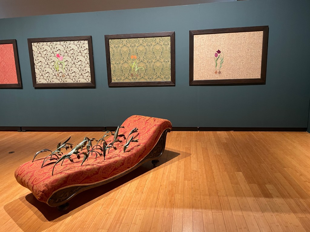 Photo: A glimpse of Sarah Maloney’s artwork. In the foreground is a piece of furniture (divan) with what look like metal plants growing up from it. Behind it are quilted panels with flowers embroidered on top of them.