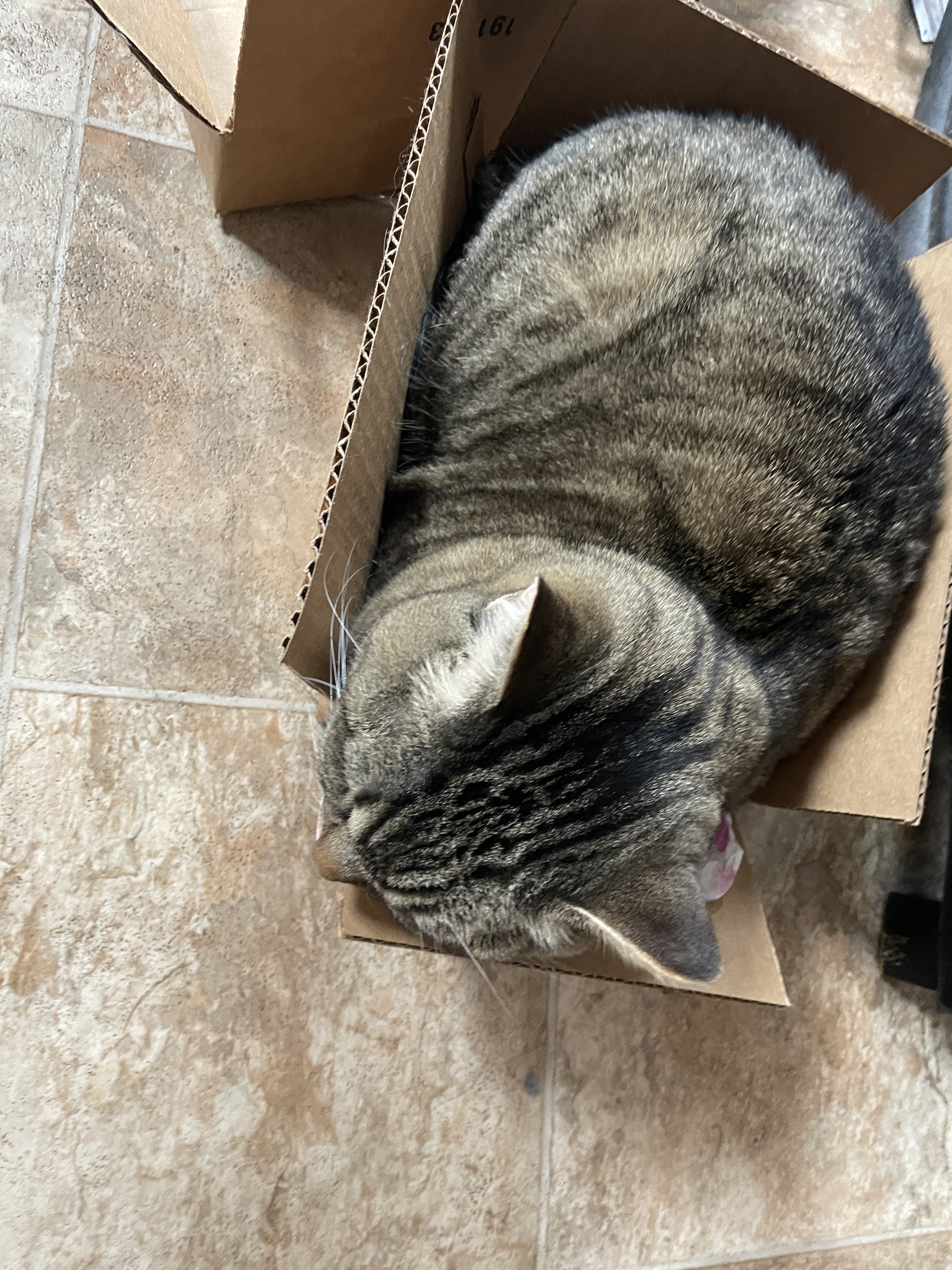 Photo: My cat, Squeak, takes a pause in a cardboard box on our kitchen floor.